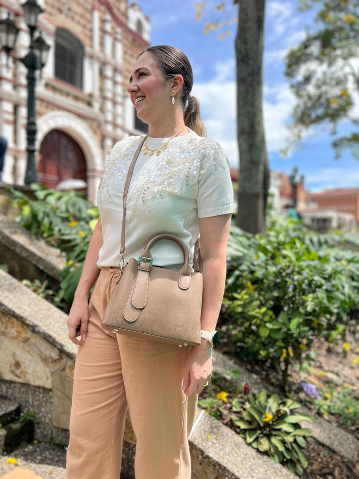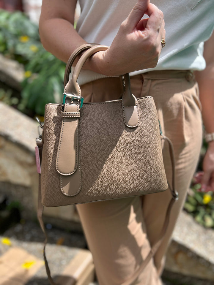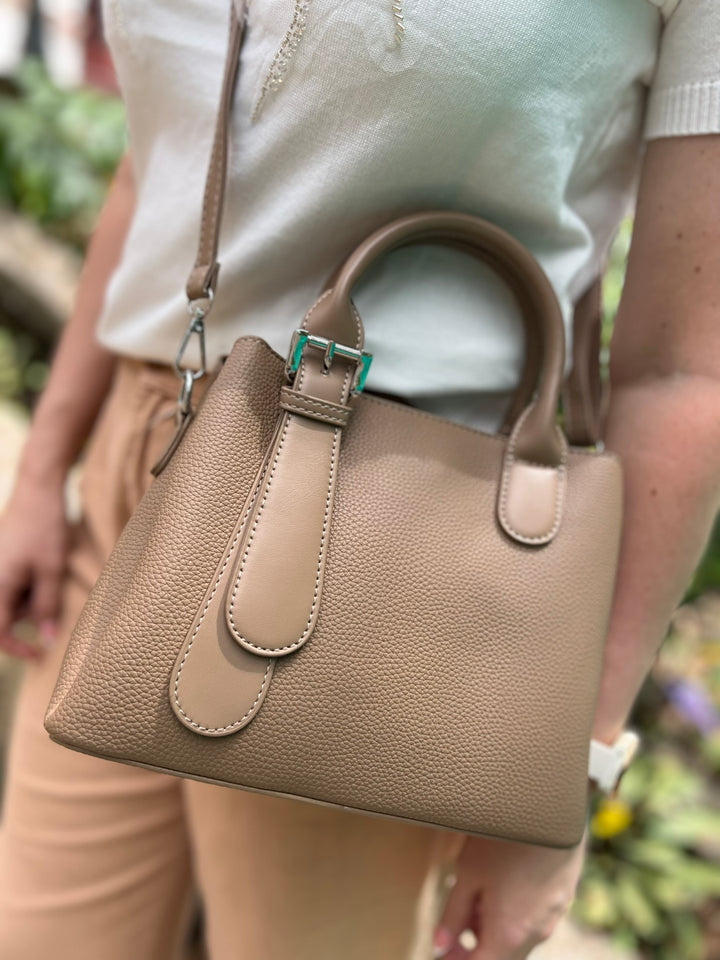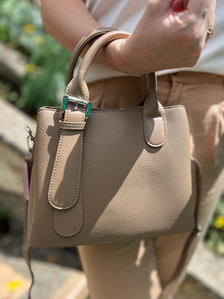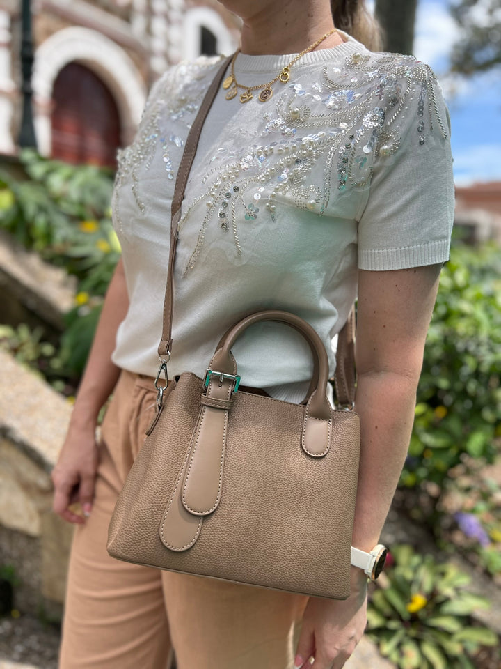 Como detalle distintivo, incluye una correa decorativa con hebillas metálicas plateadas, que añade un toque moderno y chic al diseño. Su estructura firme mantiene la forma del bolso, lo que lo hace perfecto para ocasiones formales o para el uso diario con estilo.