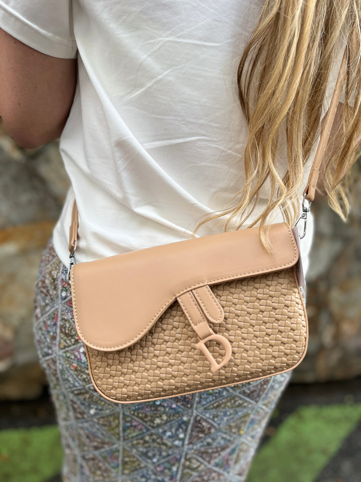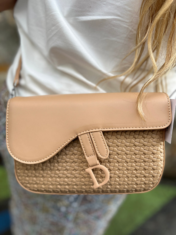 BOLSO CAFE, DOBLE CORREA, HERRAJES PLATEADOS