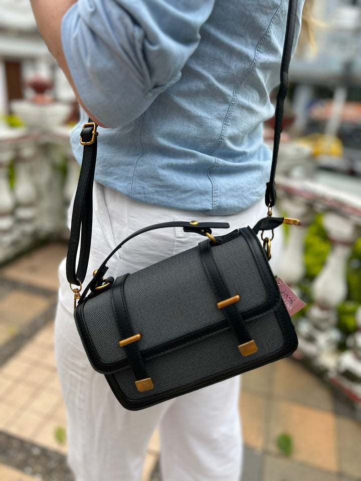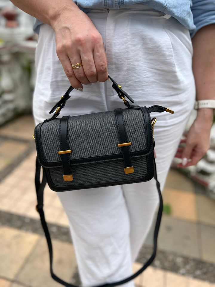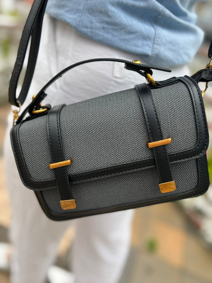 Elegancia atemporal en un diseño compacto y funcional. Este bolso bandolera en color negro está confeccionado con lona texturizada de alta calidad y detalles en cuero sintético del mismo tono. Su estructura firme y acabados dorados envejecidos lo convierten en un accesorio sofisticado, ideal para el día a día o eventos casuales con un toque de estilo.