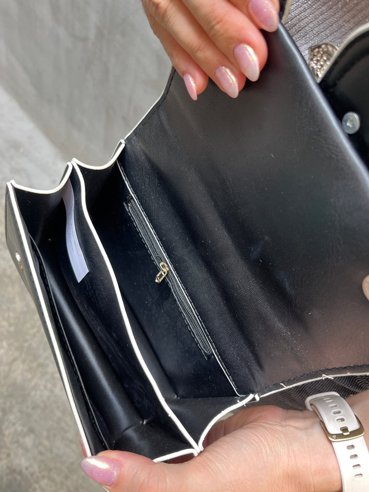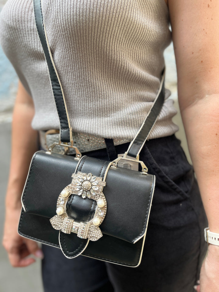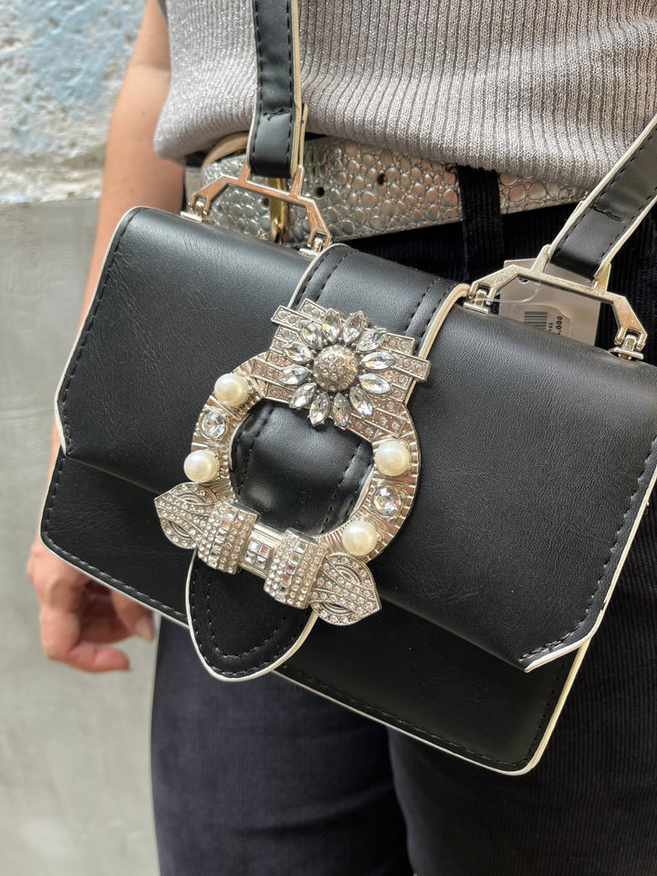 BOLSO NEGRO TIPO SOBRE CON APLIQUES BRILLANTES