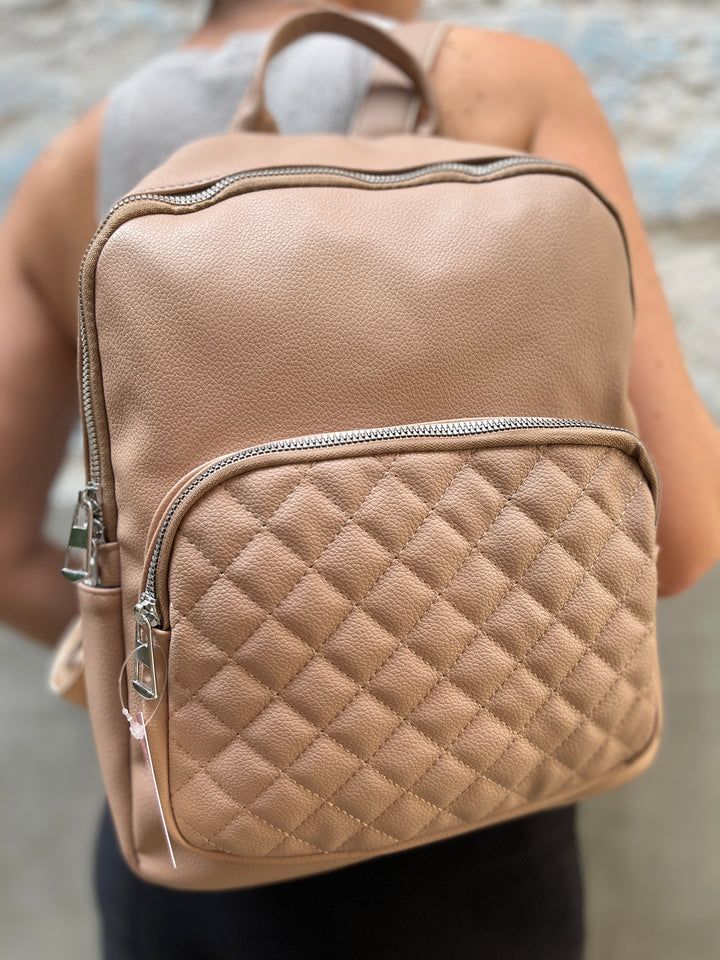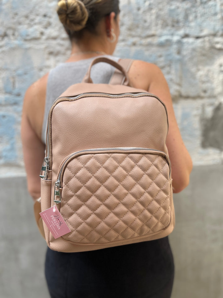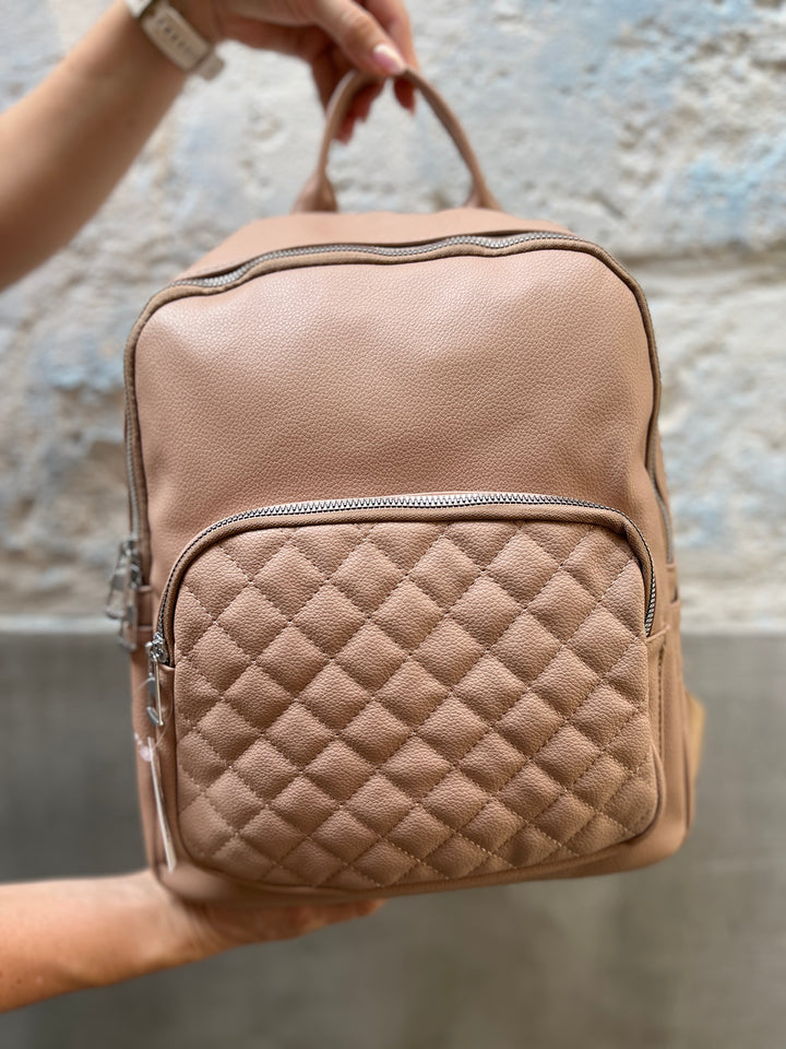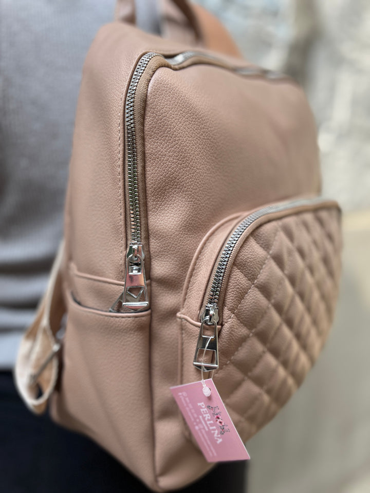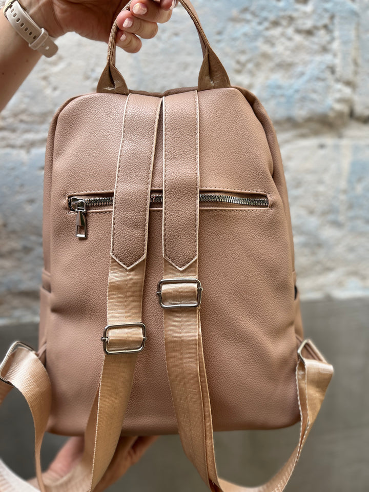 Morral moderno, bolsillo delantero externo con cierre, asa corta superior, compartimento principal con cierre de dos pies, bolsillo interno, bolsillo externo en la parte trasera correas principales delgadas graduables.