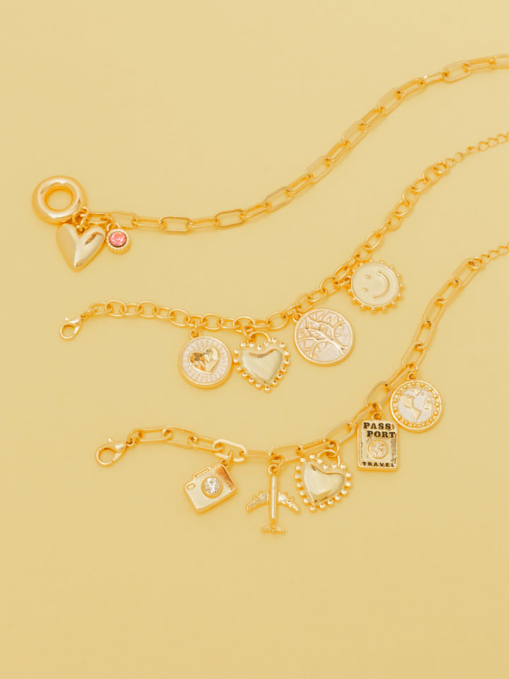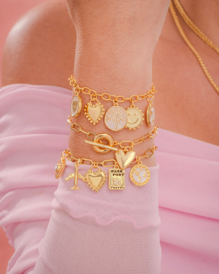 - Dijes de la pulsera en Zamak (aleación de metales) con baño de oro de 24k.