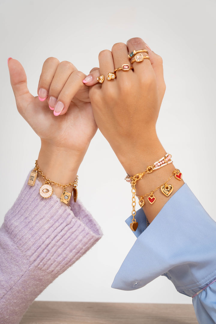 - Dijes de la pulsera en Zamak (aleación de metales) con baño de oro de 24k.