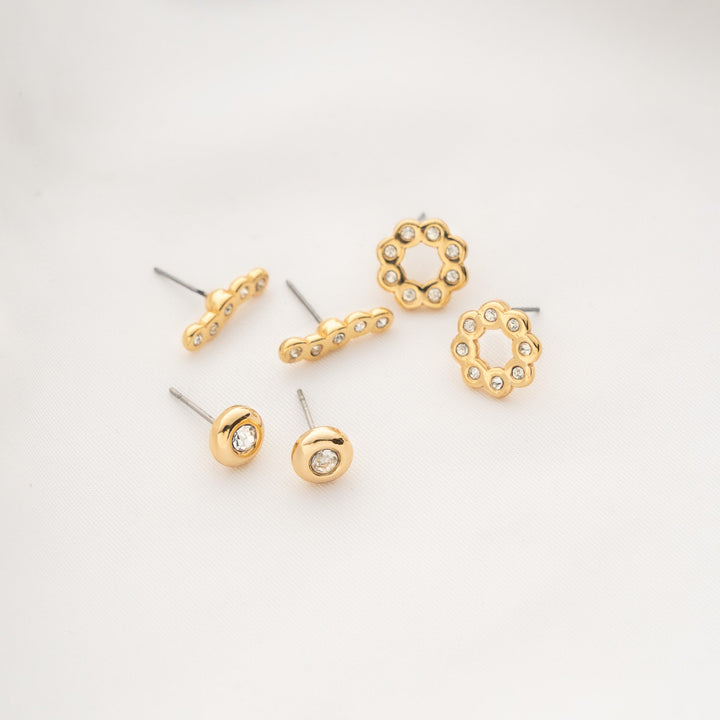 - Incluye: 1 par de topos circulo con cristales, 1 par de topos linea curva con cristales, 1 par de topos sencillos con cristal