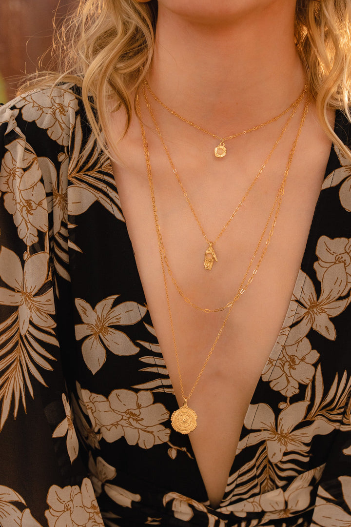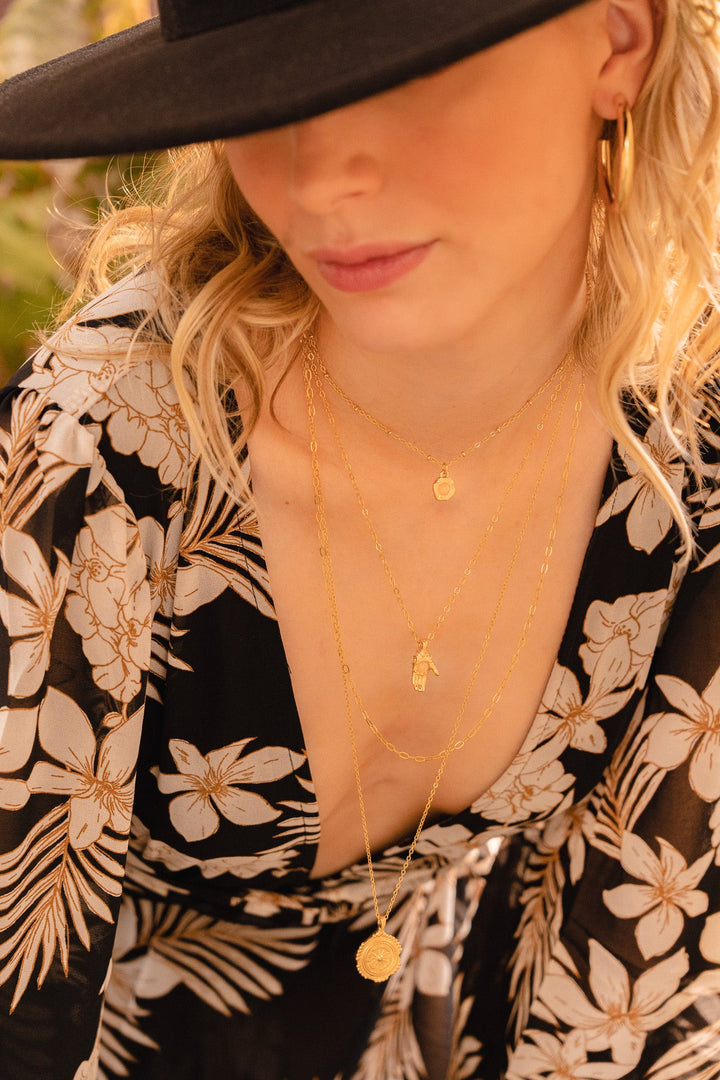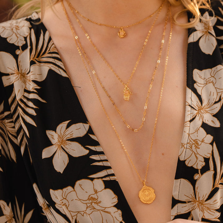 - Dijes de los collares en Zamak (aleación de metales) con baño de oro de 24k.