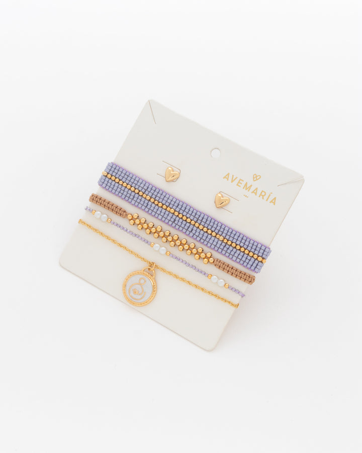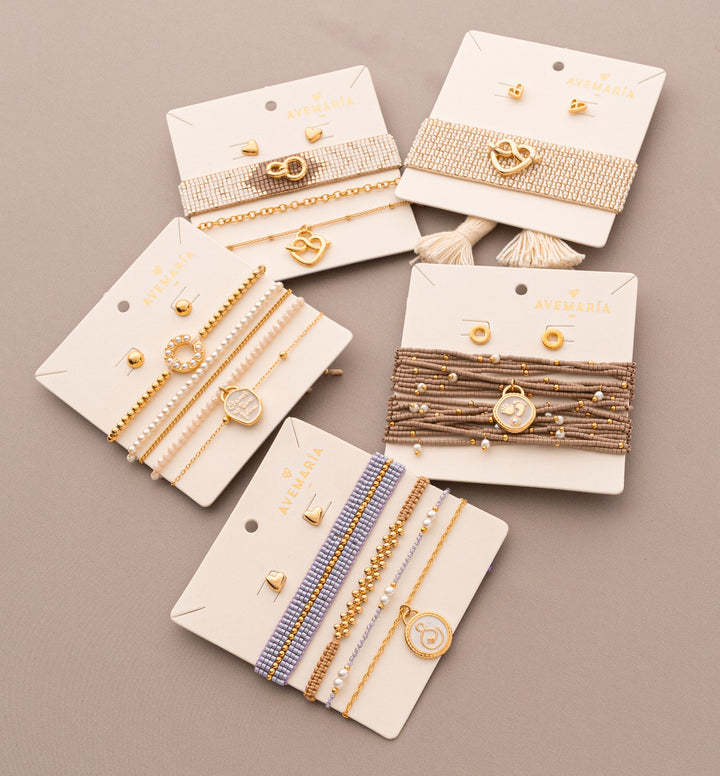 - Incluye: 3 pulseras y 1 par de aretes tipo topos (aretes pequeños), el diseño del arete te llegará según disponibilidad.