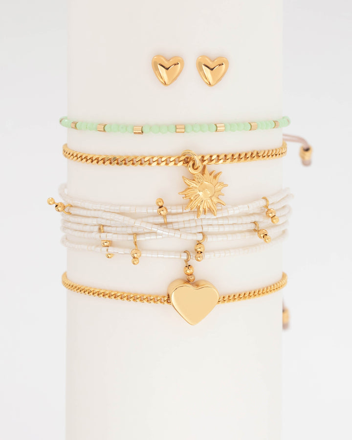- Incluye: 4 pulseras y 1 par de aretes tipo topos (aretes pequeños), el diseño del arete te llegará según disponibilidad.